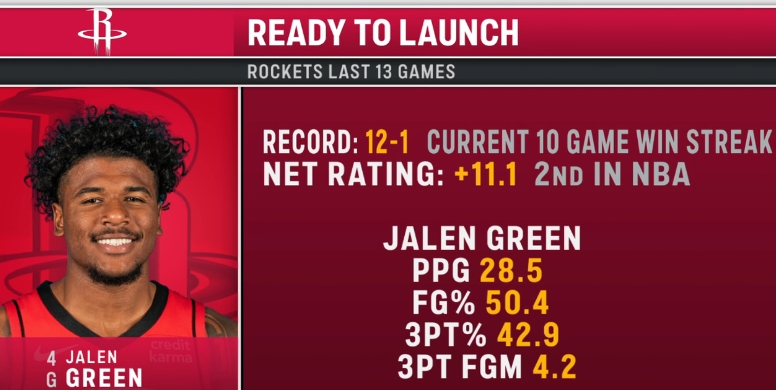 火箭近13战场均净胜11.1分联盟第二!杰伦-格林场均28.5分