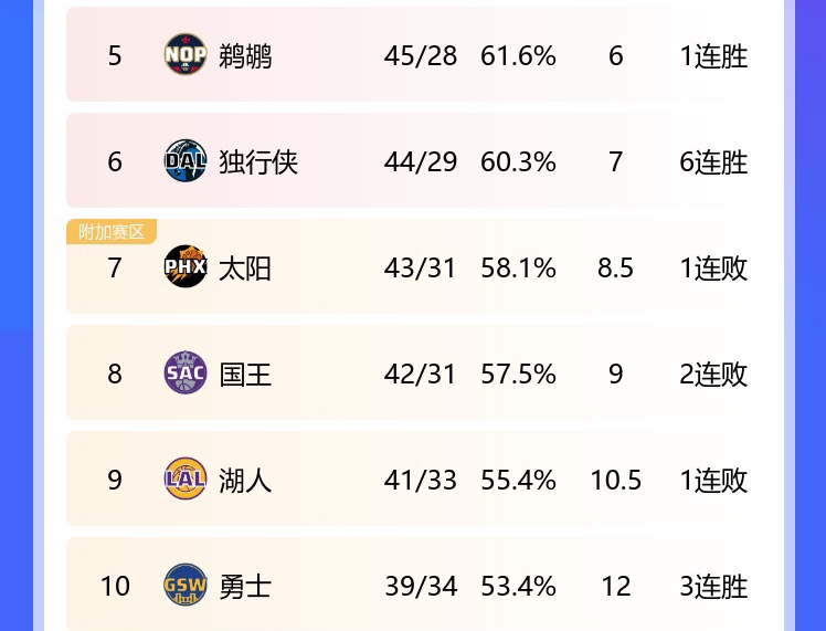 在拿下这场胜利之后,独行侠继续排在西部第六,距离第五的鹈鹕只差1个胜场,领先第七的太阳1.5个胜场,国王则掉到西部第八,湖人落后国王1.5个胜场,勇士和湖人的胜场差也是1.5个。