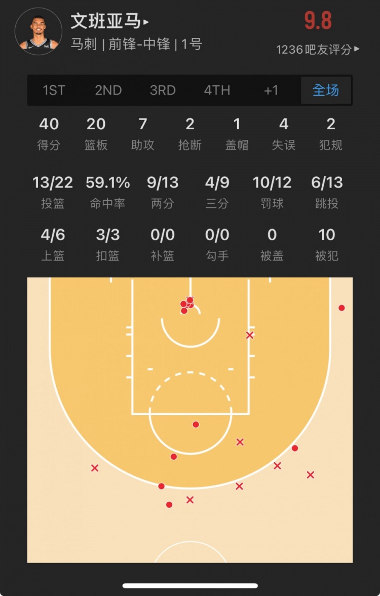马刺状元秀 维克托-文班亚马 出战37.7分钟