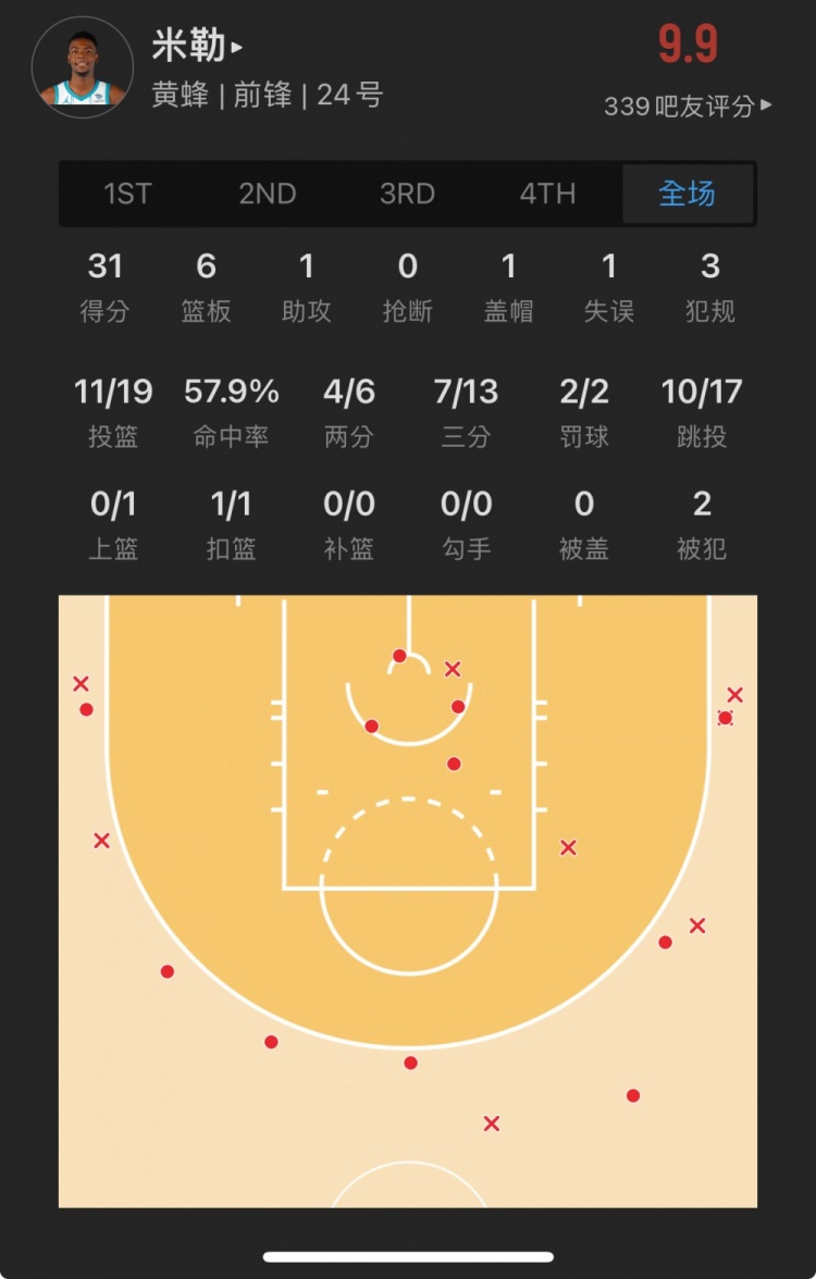 黄蜂榜眼秀 布兰登-米勒 出战32.9分钟