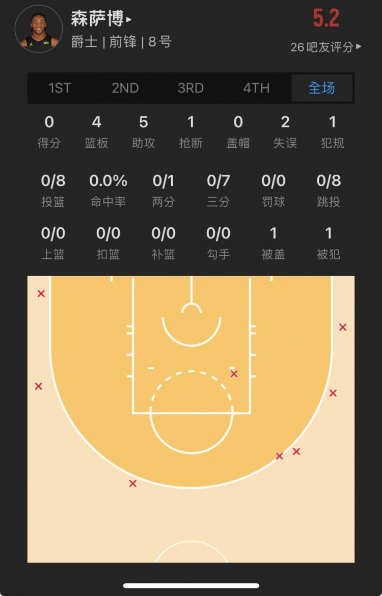 爵士28号秀 布莱斯-森萨博 出战24.7分钟