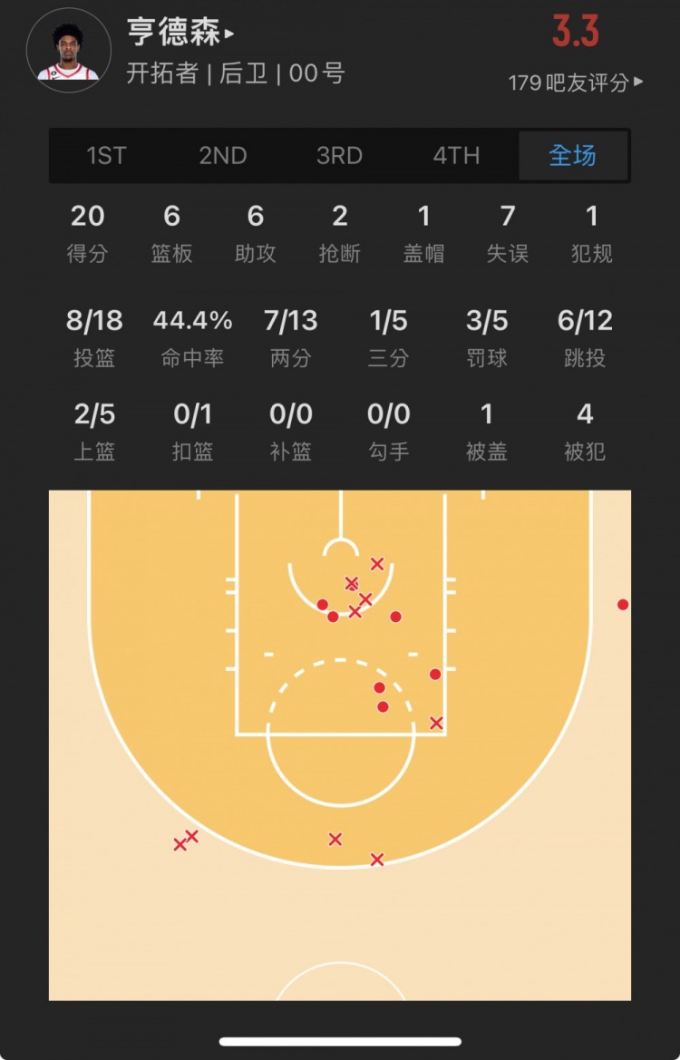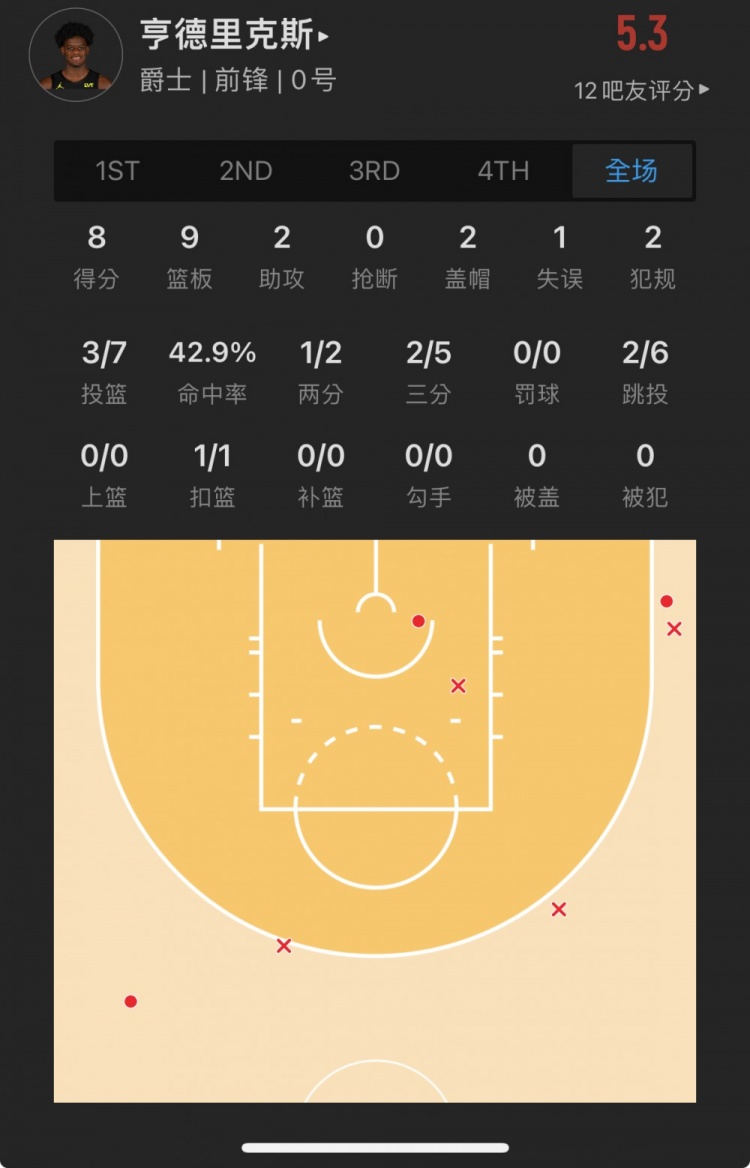 爵士9号秀 泰勒-亨德里克斯 出战34.7分钟