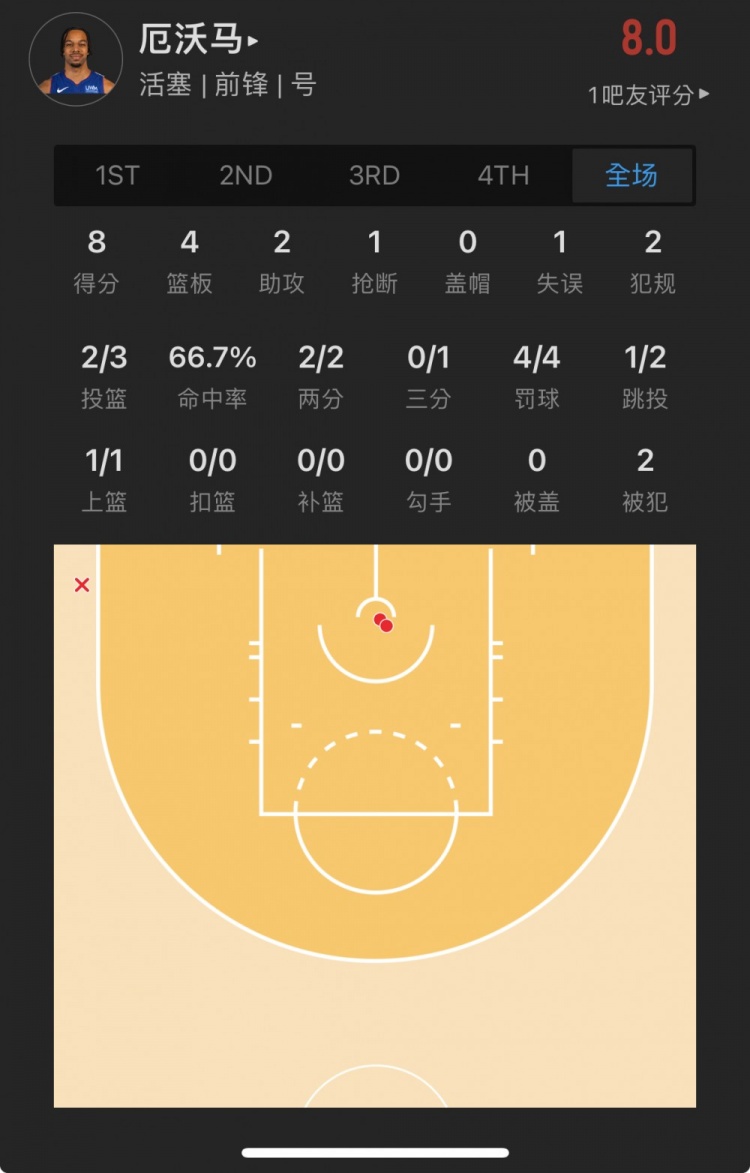 活塞落选秀 托桑-厄沃马 出战33.1分钟