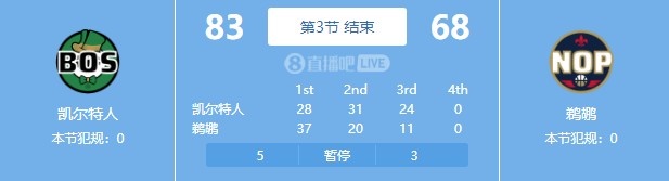 第三节,鹈鹕进攻端哑火,全队仅拿到11分,单节11-24净负13分,三节打完鹈鹕已落后凯尔特人15分。