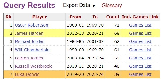据统计,东契奇生涯至今已经40次单场砍下至少40分5篮板5助攻,追平威少排名历史第6,仅次于大O(71次)、哈登(68次)、乔丹(62次)、张伯伦(61次)、詹姆斯(59次)。
