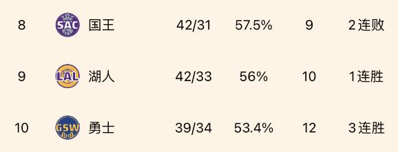 拿下本场比赛之后,湖人战绩来到42胜33负,距离身前第8的国王只差1个胜场,而胜场数湖人已经追平国王!