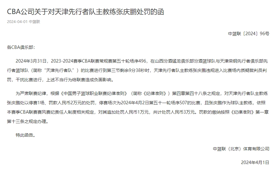 为严肃联赛纪律,根据《中国男子篮球职业联赛纪律准则》(简称《纪律准则》)第四章第四十八条之规定,对天津先行者队主教练张庆鹏处以停赛1场、罚款人民币2万元的处罚,停赛场次为2024年4月2日第五十一轮场序507的比赛,且张庆鹏作为球队主教练,依照本赛季CBA联赛赛风赛纪责任人制度相关规定,对其追加处罚人民币1万元,共计处罚人民币3万元。罚款的缴纳按照《纪律准则》第一章第十三条之规定办理。
