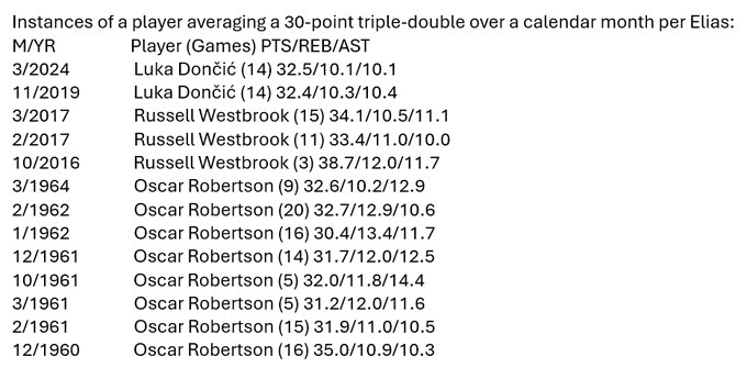 据统计,这是东契奇生涯第二次在单个自然月内拿到30+三双,NBA历史仅次于威少(3次)和大O(8次)。