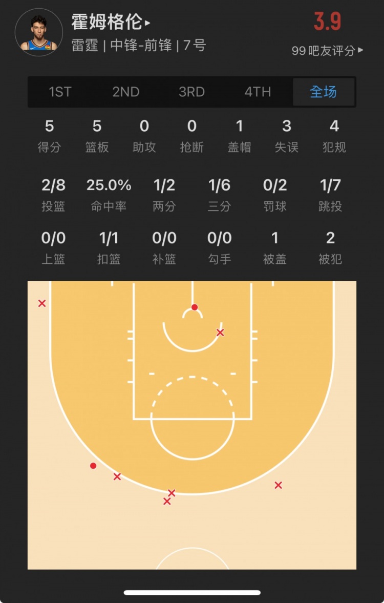 雷霆上届榜眼秀 切特-霍姆格伦 出战26.2分钟