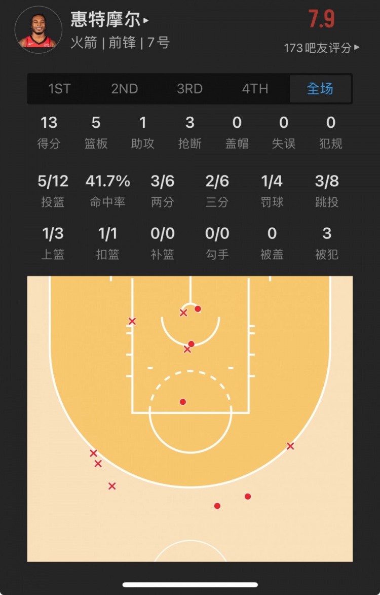 火箭20号秀 卡姆-惠特摩尔 出战22.1分钟