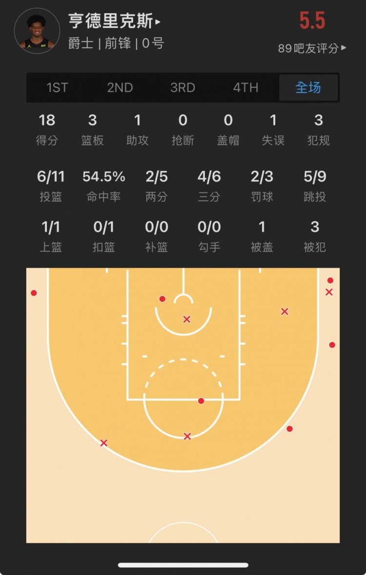 爵士9号秀 泰勒-亨德里克斯 出战28.0分钟