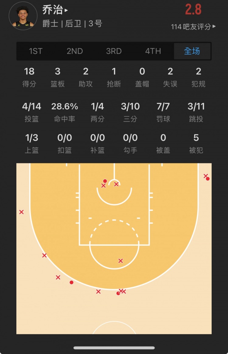 爵士16号秀 基昂特-乔治 出战36.9分钟