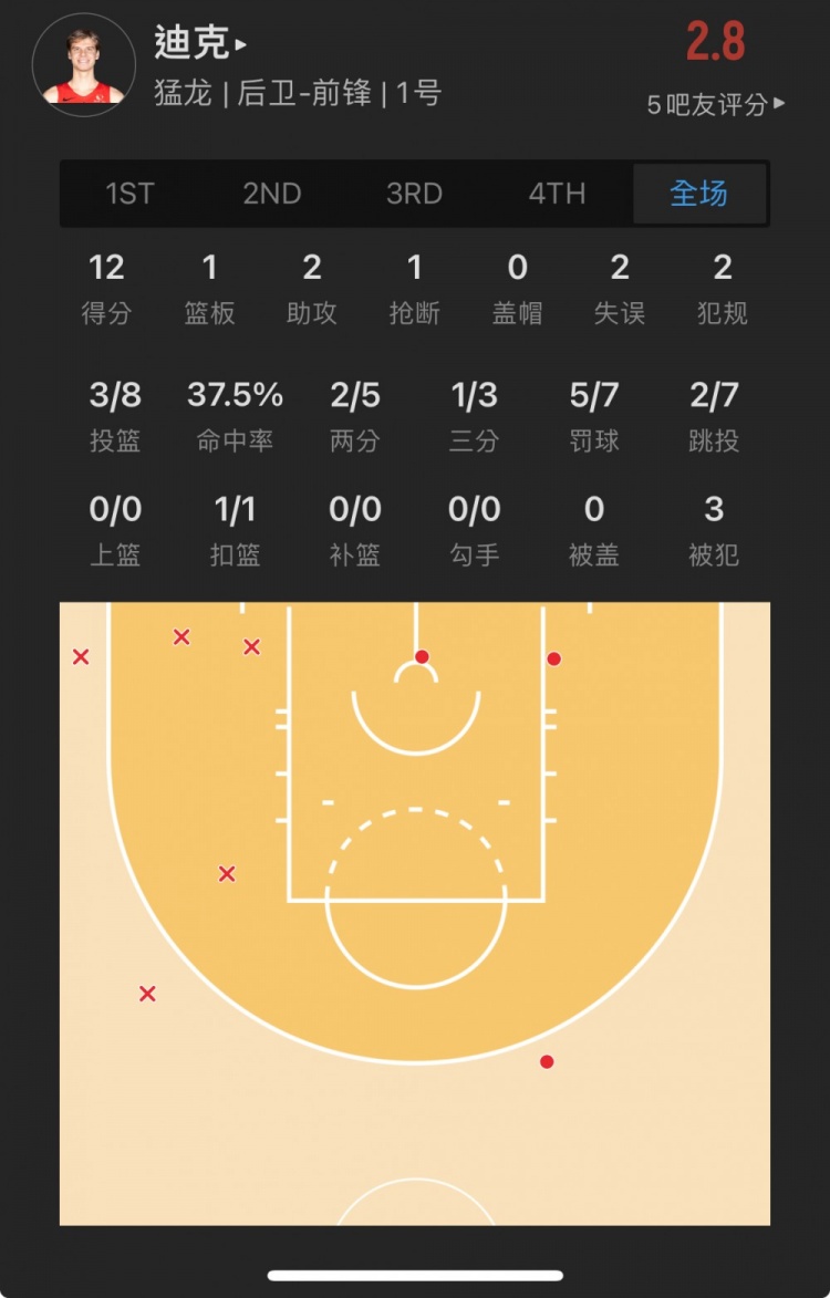 猛龙13号秀 格雷迪-迪克 出战31.1分钟