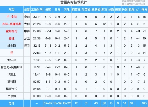 本场比赛,亚历山大和杰伦-威廉姆斯缺阵但雷霆仍有5人得分上双。分别是:切特22分、多特15分、维金斯15分、以赛亚-乔14分、基迪10分。