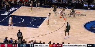 比赛第二节末段,森林狼打出一波20-2的进攻高潮,单节轰下38分,单节领先火箭16分!