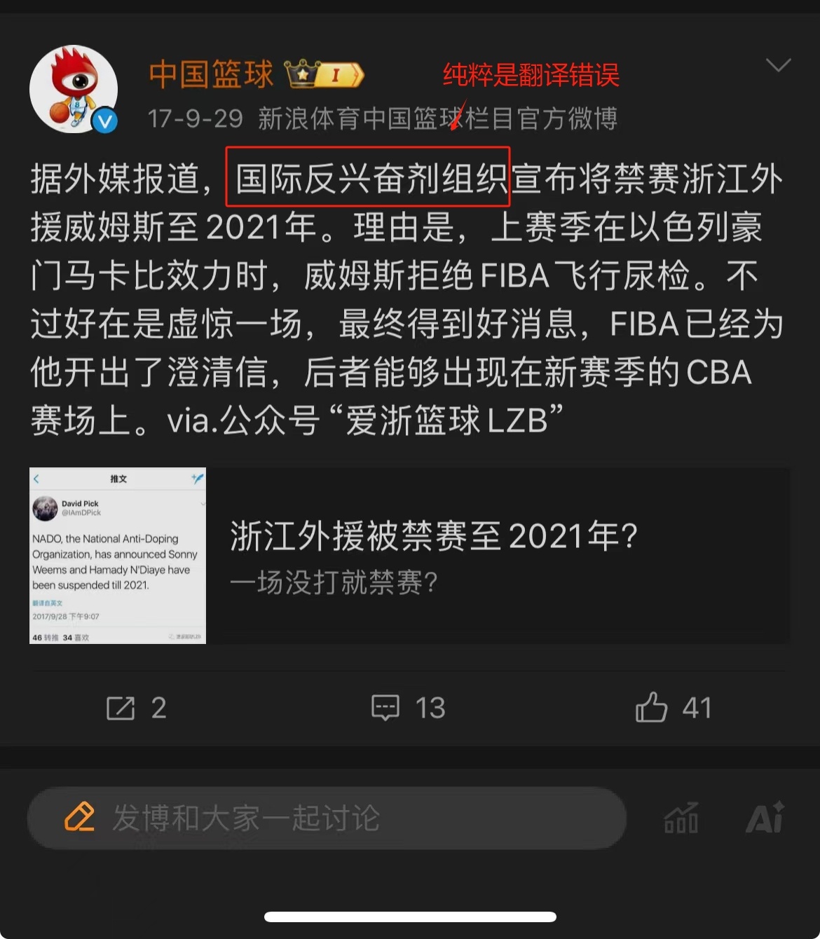 但这事情为啥会突然被人拿来做文章,甚至借此把CBA渲染成法外之地,除了一些人习惯性造谣之外,可能还有个原因:6年前某个中文自媒体号不小心把NADO翻译成了WADA,刚好谣棍们没什么文化就跳坑了……”