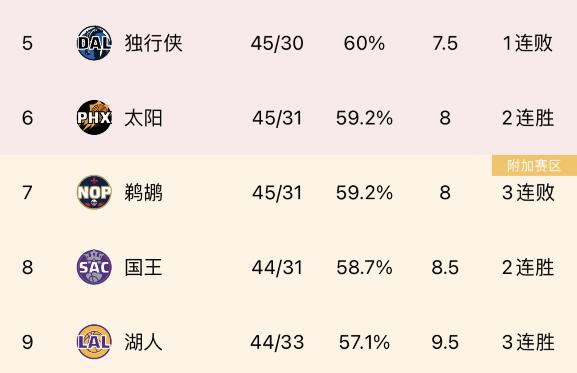 本场比赛之后,太阳战绩来到45胜31负(对阵鹈鹕有交手优势2-0),从西部第8,升至西部第6!