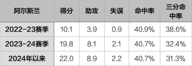 如果我们只看2024年以来的表现,那么阿尔斯兰的数据还能再提升一截,达到场均22分4.4篮板8.9助攻的级别。