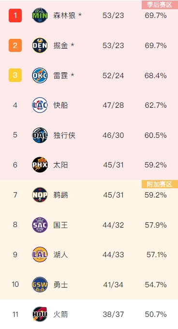 在双杀老鹰之后,独行侠的战绩来到46胜30负,排在西部第5,即便最后6场全输排名也会在火箭(西部第11)之前,因此独行侠锁定西部前10,至少有附加赛打。