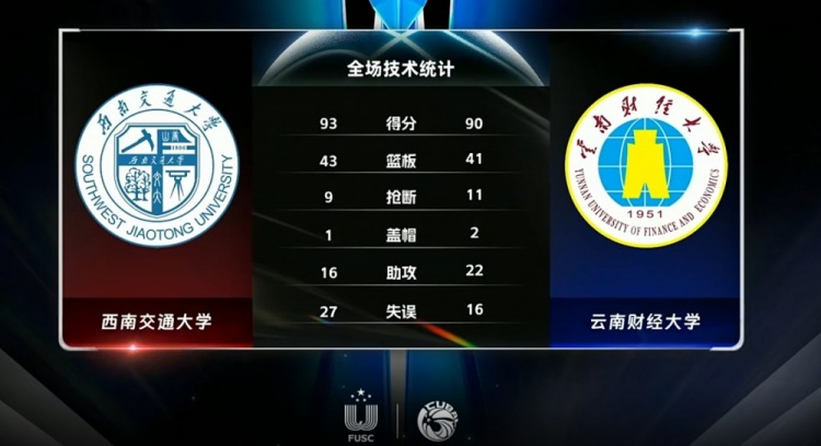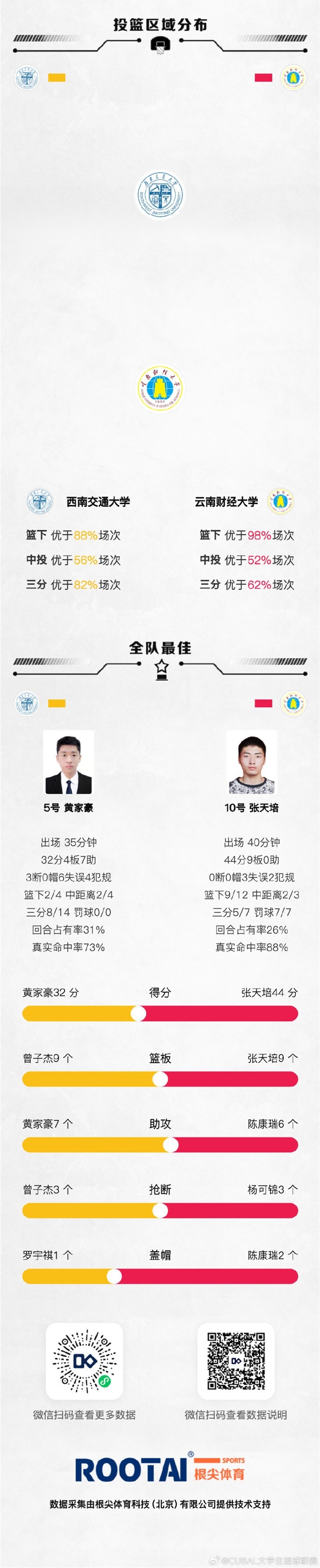 云南财经大学:张天培44分9篮板、黄海洋20分9篮板2助攻、鲍鑫洋12分5篮板、杨建5分4篮板4助攻;杨柯5分3篮板2助攻;胡明宇4分6助攻、陈康瑞4篮板6助攻3抢断