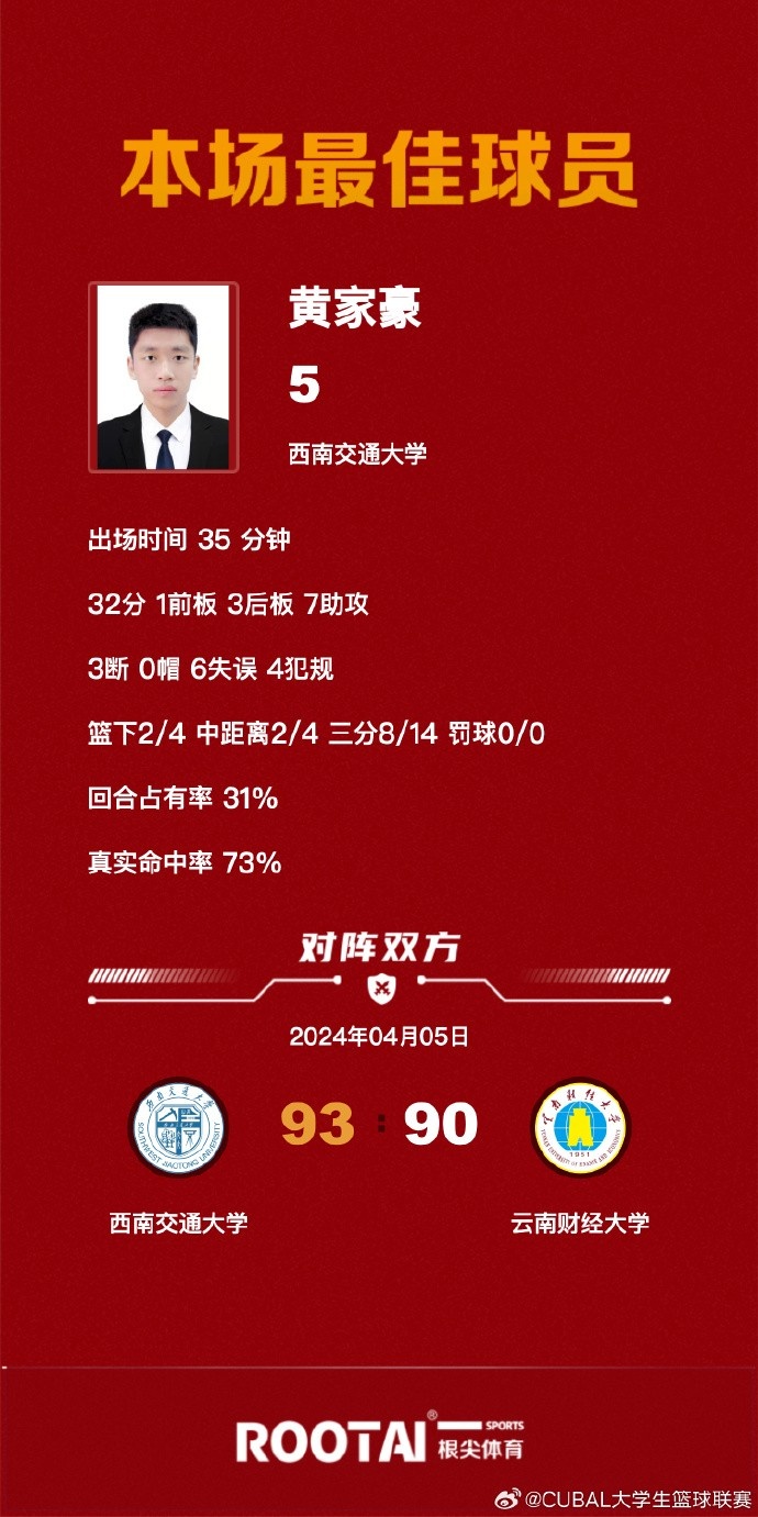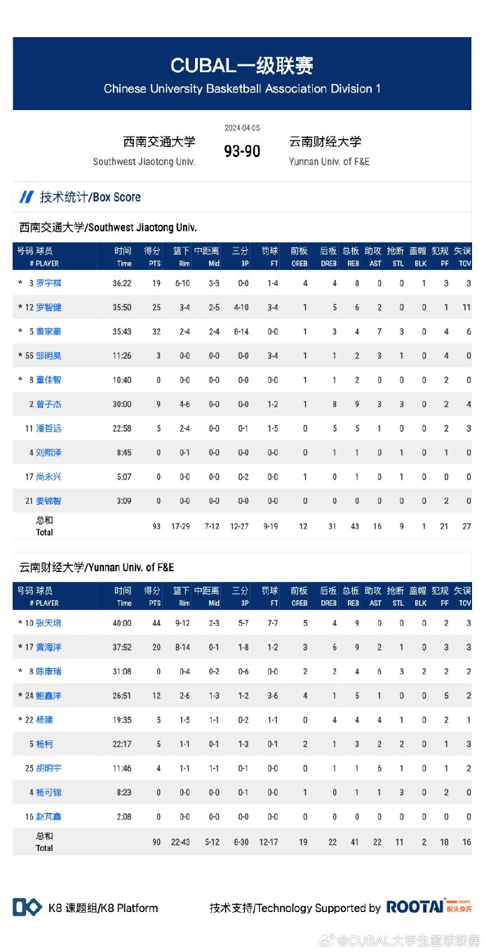 西南交通大学:黄家豪32分4篮板7助攻3抢断、罗智健25分6篮板2助攻、罗宇祺19分8篮板、曾子杰9分9篮板3助攻3抢断、潘哲远5分5篮板。