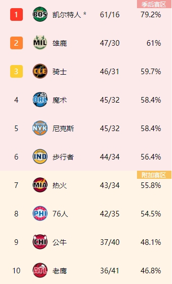 雄鹿目前战绩47胜30负,仅领先东部第3的骑士1个胜场。