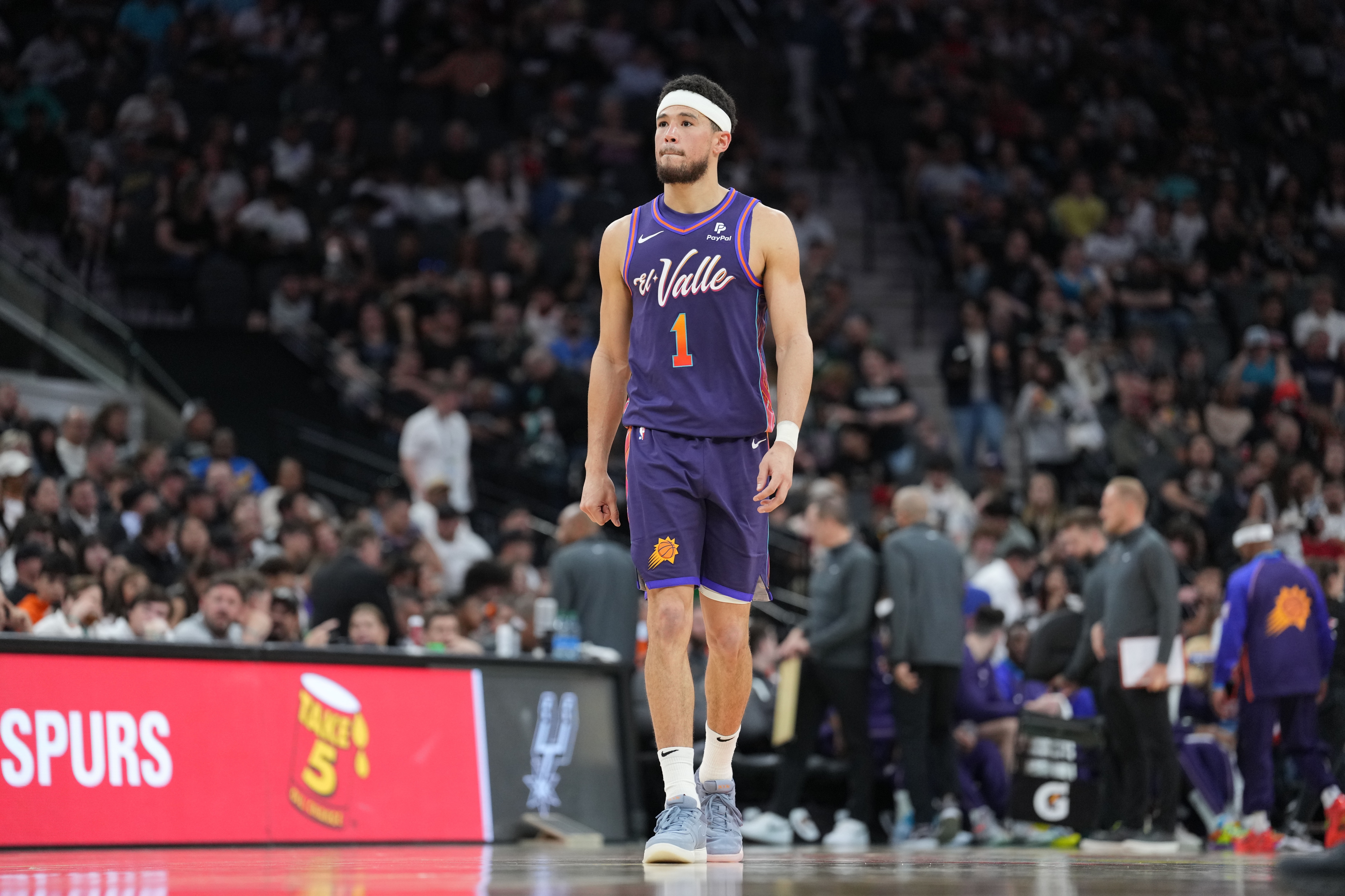 本场比赛,布克出战38分钟,投篮16中5,三分球6中2,罚球6中6,拿到18分2篮板5助攻1抢断。