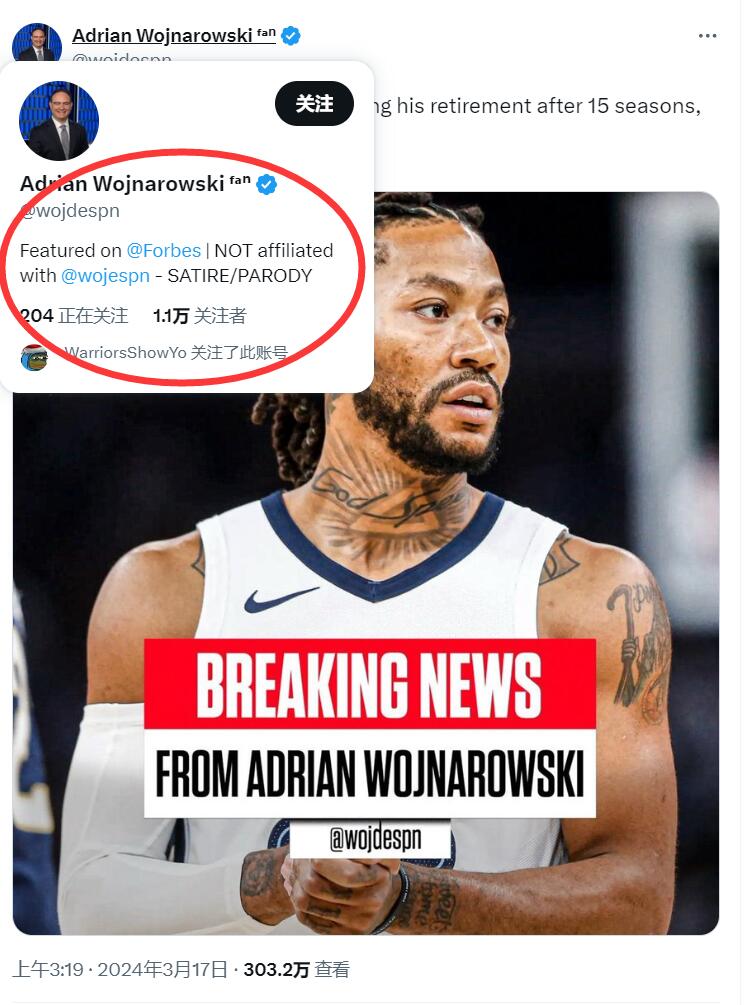 03月17日讯 今日,一位冒充Woj的推特账户报道,德里克-罗斯退役。