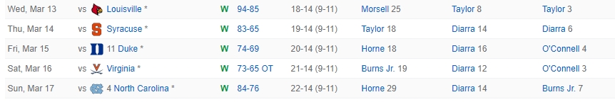 作为10号种子,北卡州大在ACC锦标赛中没有轮空的轮次。但他们在5天内连打5场比赛,一路连克杜克、北卡等强敌,取得5连胜。北卡州大夺得了37年来的首个冠军,也成为了历史上首个夺得ACC锦标赛冠军的两位数种子队。