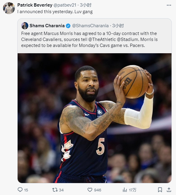 贝弗利自己也转发了Shams的报道,并写道:“我昨天就宣布过了。”