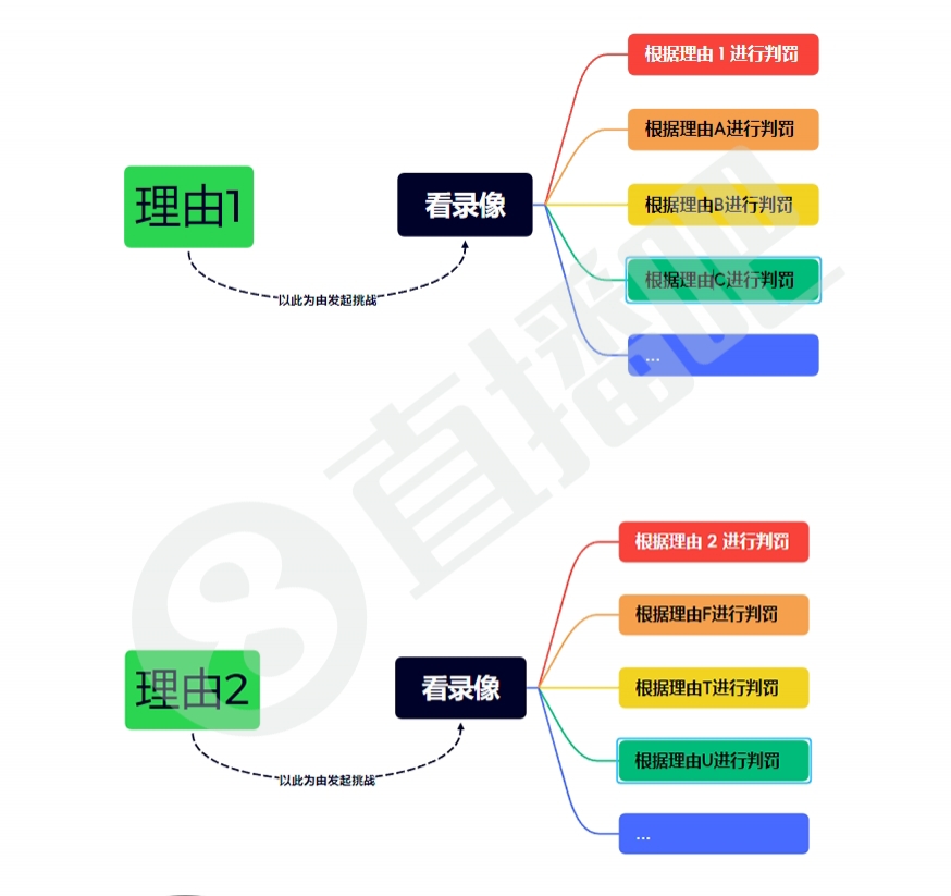 16个“发起理由”各自对应多个“改判理由”,其中,在1、3、5、6、7、9、15、16这8个“发起理由”所对应的“改判理由”中,均有“投篮人在投篮之前是否踩线”这一改判理由。