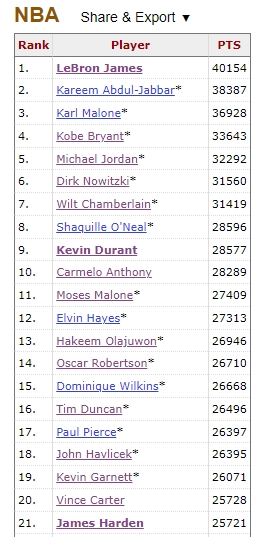哈登在末节投进一记底角三分后,本场得分来到9分,生涯总得分来到25730,超越卡特来到历史第20。