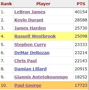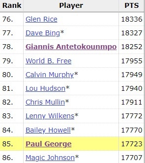 据统计,本场比赛结束后,乔治生涯总得分达到17723分,超越魔术师(17707)排名历史第85位,现役排名第10位。