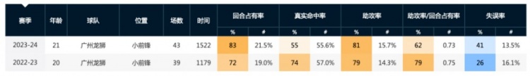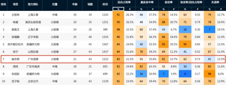 尽管失误率比上赛季要改善一些,但与全联盟横向比较,仍然是中等偏下的水平。在回合使用率前10的本土球员里,只有两个人的失误率要高于平均水平,一个是郭昊文,另一个则是小崔。