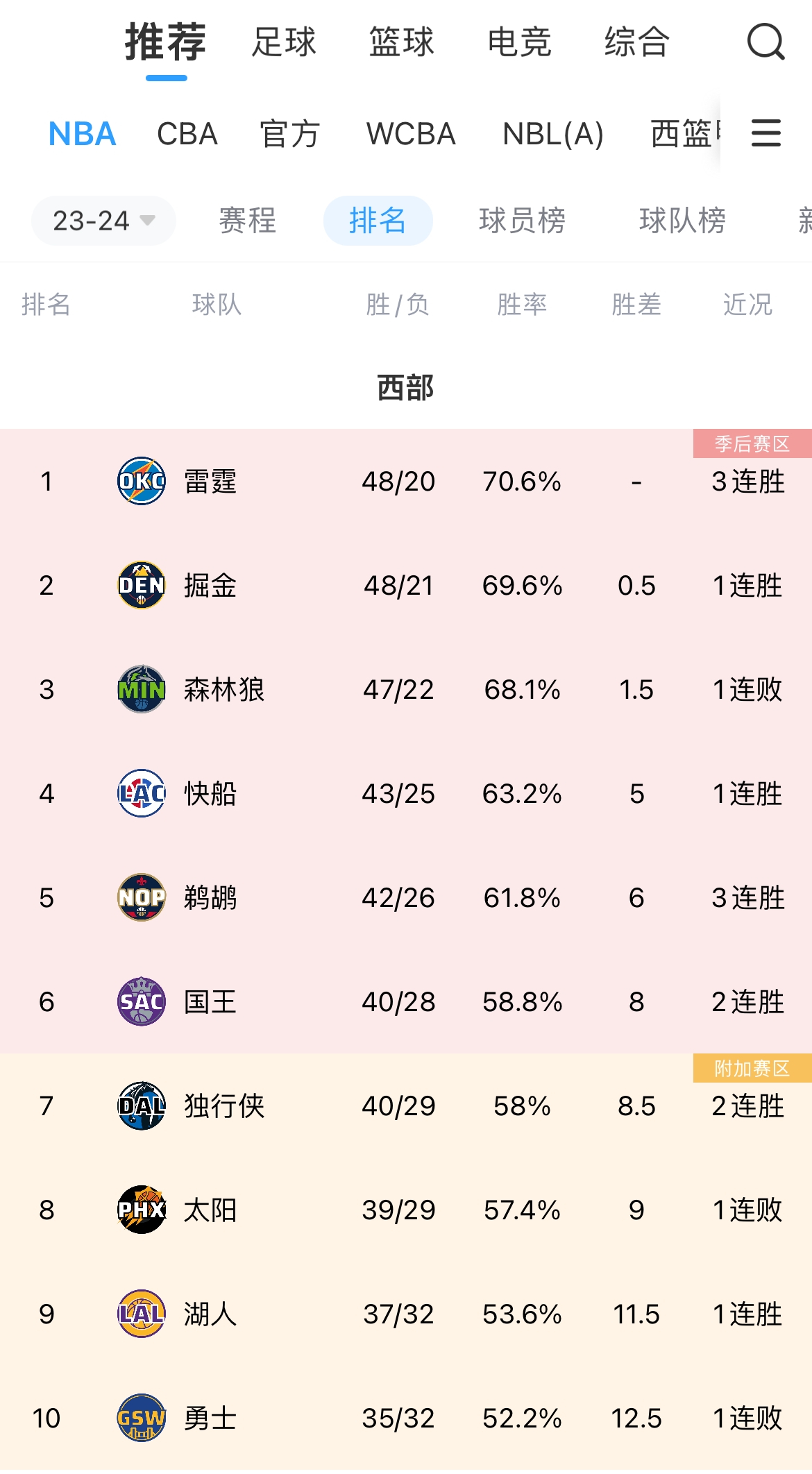 这样,快船领先第五的鹈鹕一个胜场,稳了一稳自己的位置。