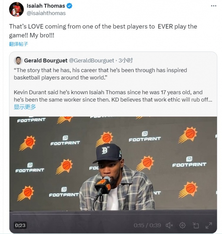 小托马斯转发KD采访表示写道:“这是来自史上最佳球员之一的爱!我的兄弟!!”