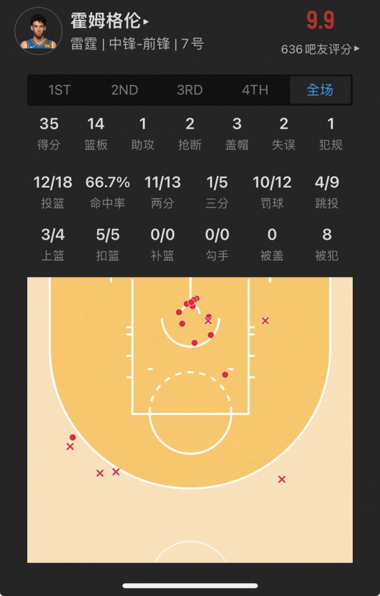 雷霆上届榜眼秀 切特-霍姆格伦 出战30.8分钟