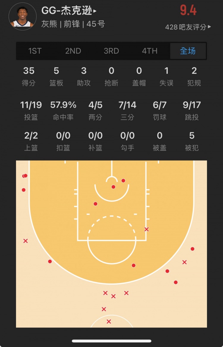 灰熊45号秀 GG-杰克逊二世 出战34.9分钟