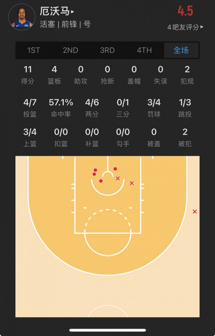 活塞落选秀 托桑-厄沃马 出战29.6分钟