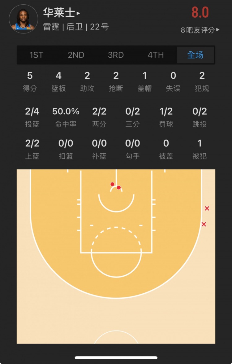 雷霆10号秀 卡森-华莱士 出战22.5分钟
