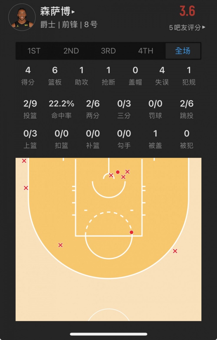 爵士28号秀 布莱斯-森萨博 出战20.2分钟