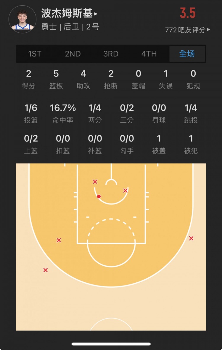 勇士19号秀 布兰丁-波杰姆斯基 出战17.8分钟