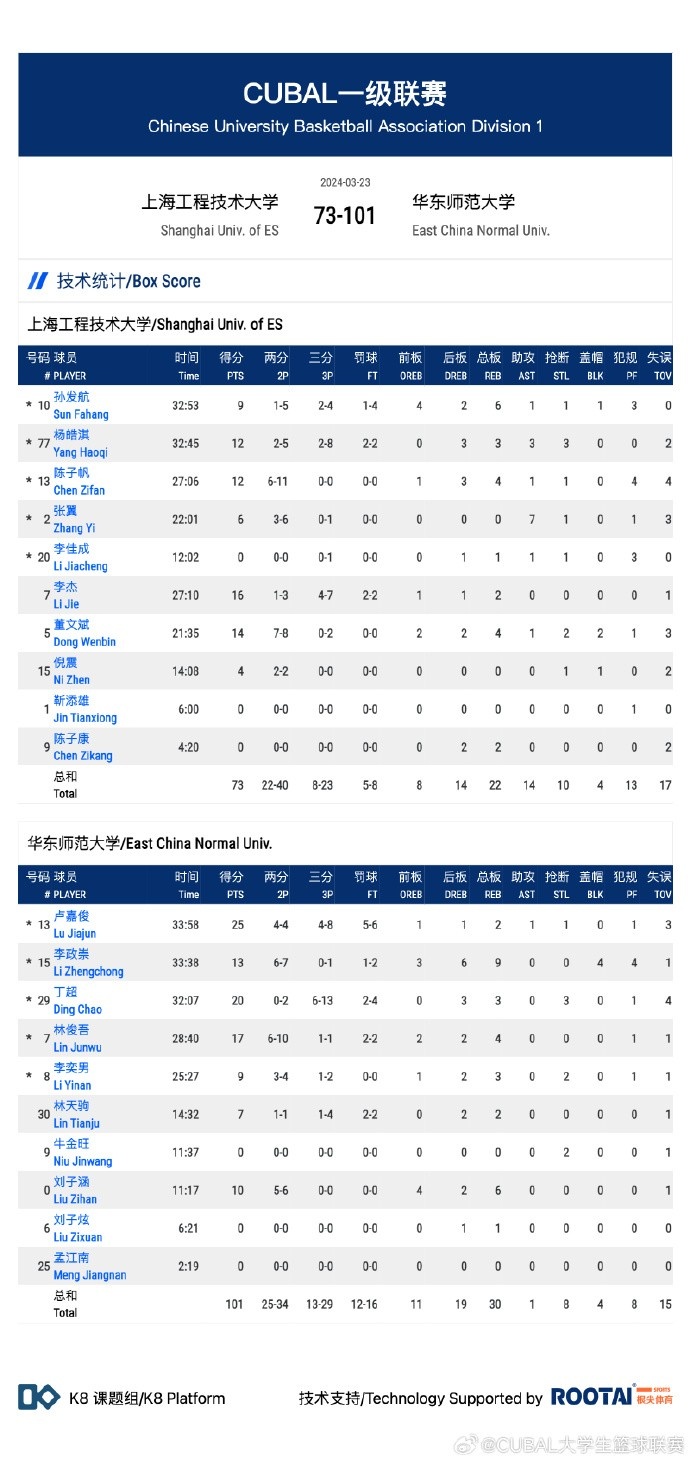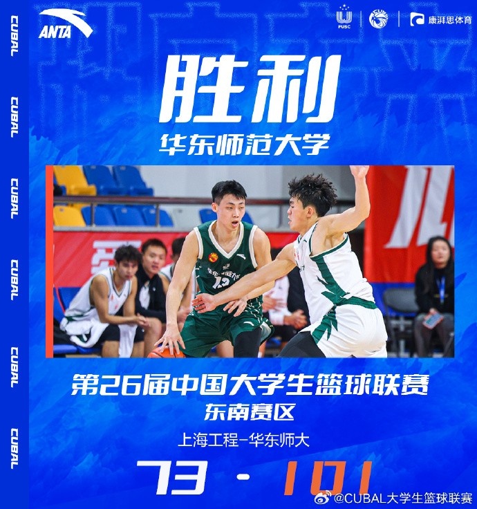 末节比赛,上海工程奋力反击,连投带罚打出10-0的攻击波缩小分差,又是丁超三分稳住局势,此后华东师大轮番冲击内线拿分继续扩大优势,最终,华东师大101-73轻取上海工程,获得胜利。