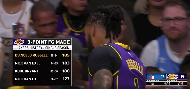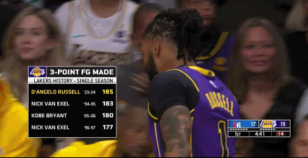 拉塞尔命中本赛季个人第184记三分球 成为湖人队史单季三分王