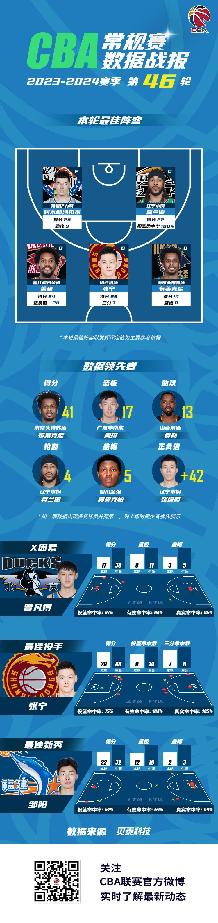2023-2024赛季CBA联赛常规赛第46轮结束较量,来自新疆广汇篮球俱乐部的阿不都沙拉木 、辽宁沈阳三生飞豹篮球俱乐部的莫兰德、浙江稠州篮球俱乐部的盖利、山西汾酒职业篮球俱乐部的张宁和南京同曦篮球俱乐部的布莱克尼入选CBA联赛常规赛第46轮最佳阵容!