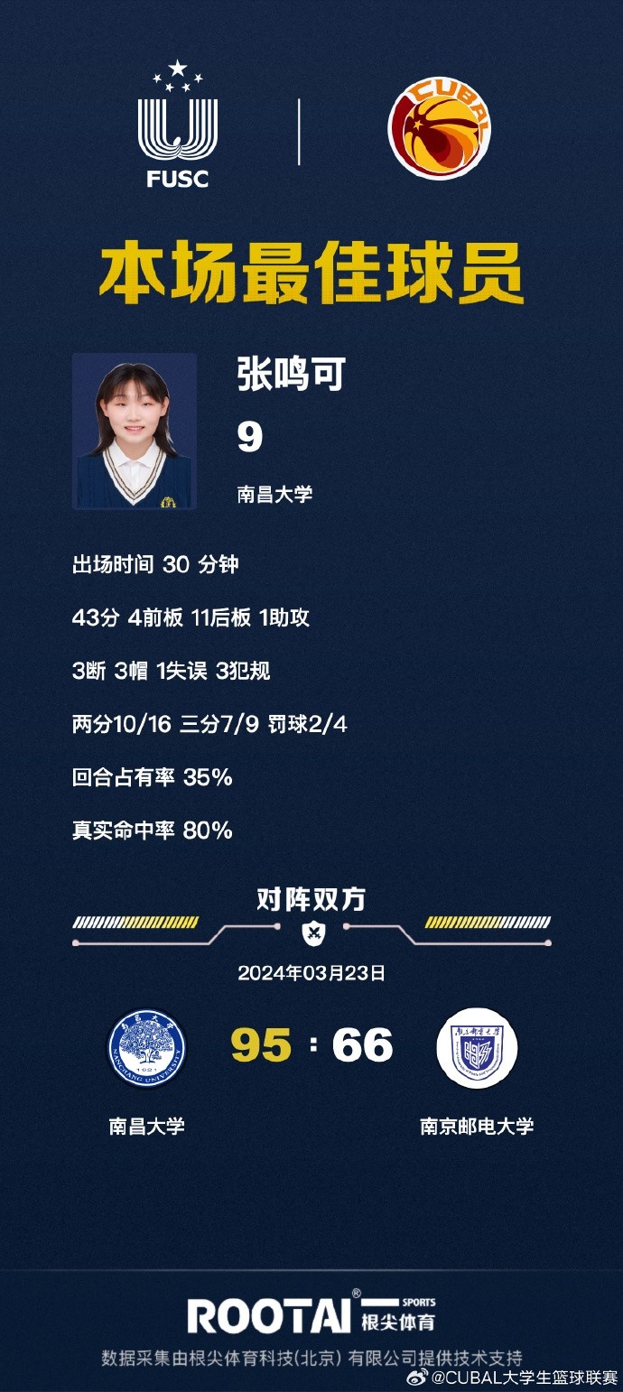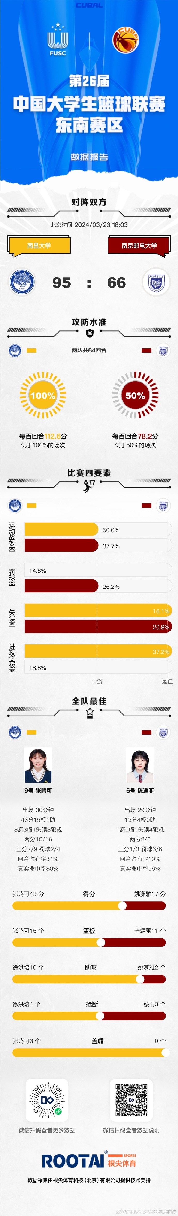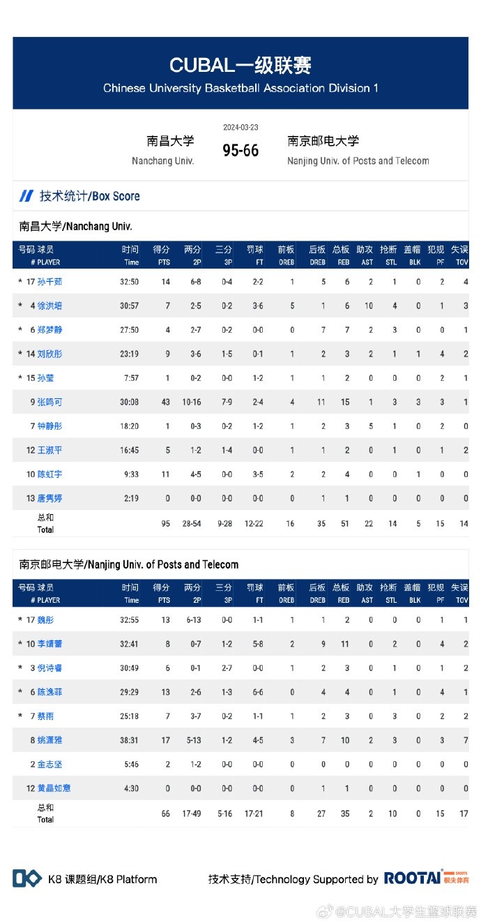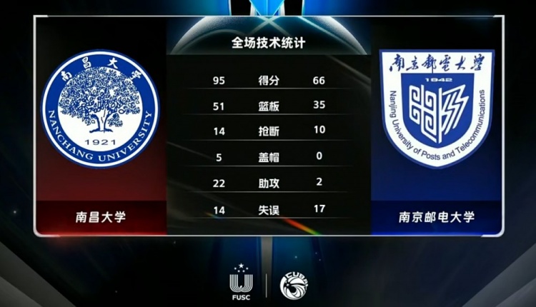 末节南邮终于在场面上占优并以5-0开局,随后以倪诗睿的三分为首为球队追回小部分劣势,不过南昌大学优势依旧巨大没有感受到太大威胁,尤其是状态火热的张鸣可继续爆发式拿分为球队收下比赛。最终,南昌大学95-66轻取南京邮电大学拿下比赛。