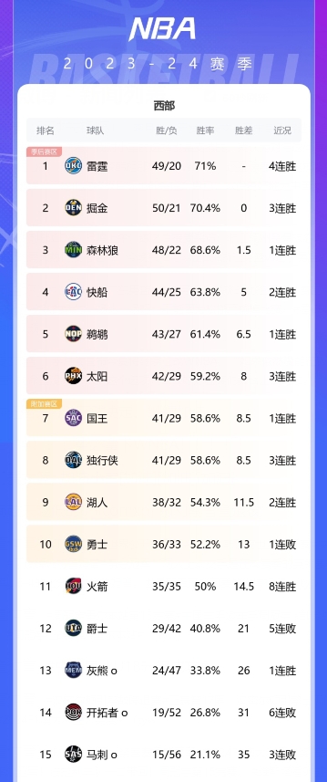 目前,掘金以50胜21负排名西区次席,雷霆(49胜20负)胜率更高位列西区榜首。