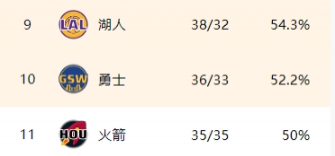 排名方面,火箭继续紧追附加赛区排名第十的勇士,双方之间胜场差只差1.5场。