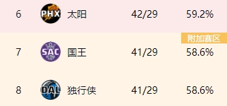 太阳战绩来到42-29排在西部第6,只领先身后的国王和独行侠0.5胜场。