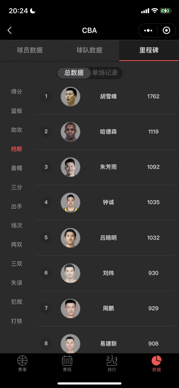 目前比赛进行到第二节,辽宁球员赵继伟已经拿到两次抢断,这样他的生涯总抢断数达到802次,超越西热力江位列CBA历史第十位。